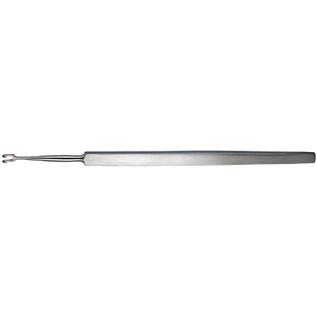 Surgical Green‘s Guthrie Skin Hook – Double Prong consists of a long flat handle and a hook-type working end. The solid handle grants great instrument control. The hook has two sharp prongs available in different widths to reach different types of skin.